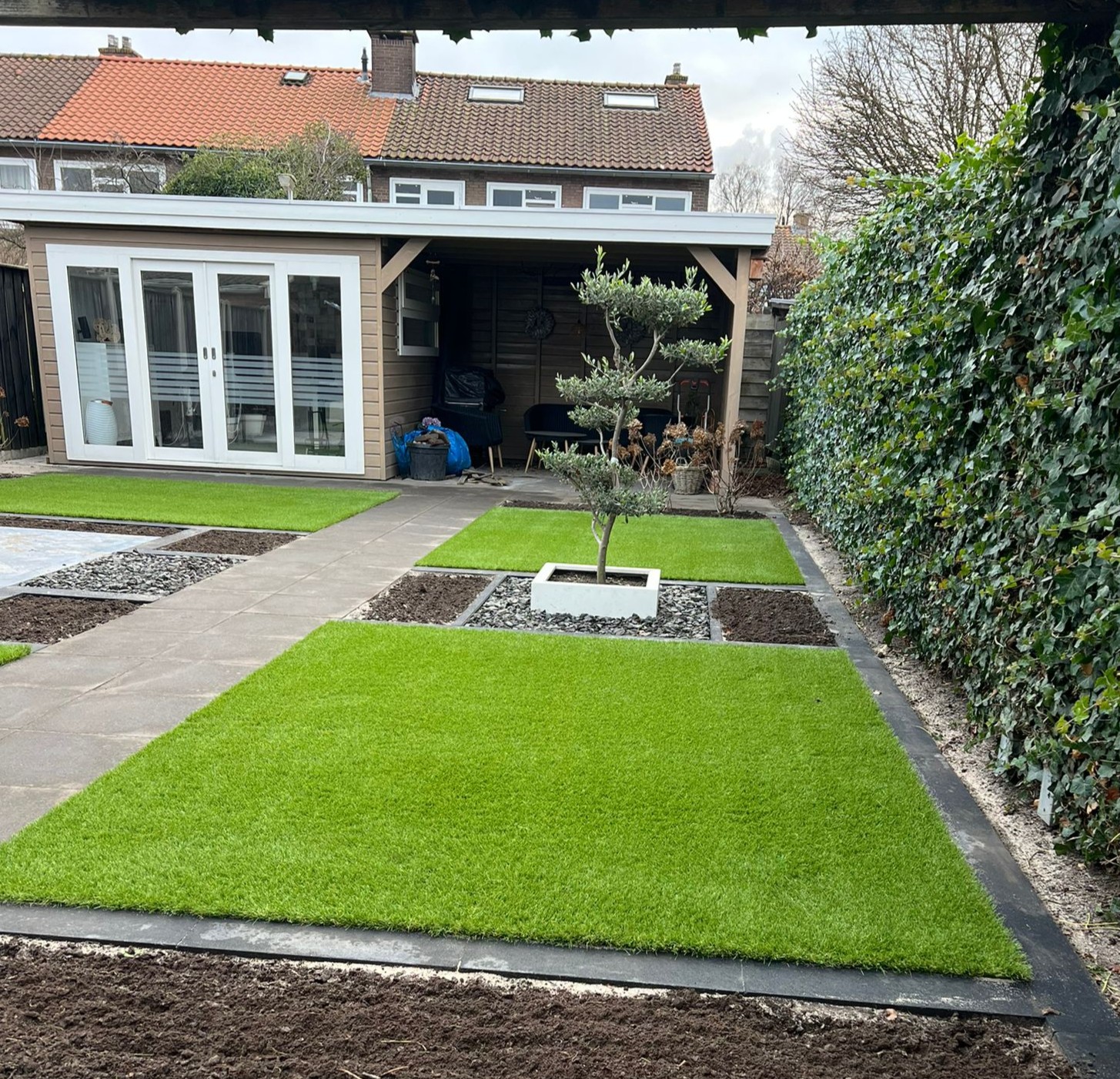 Deze tuin hebben we in december aangelegd, wist je dat we ook in de winter kunstgras aanleggen? Zo geniet je het hele jaar van een frisse, groene tuin.